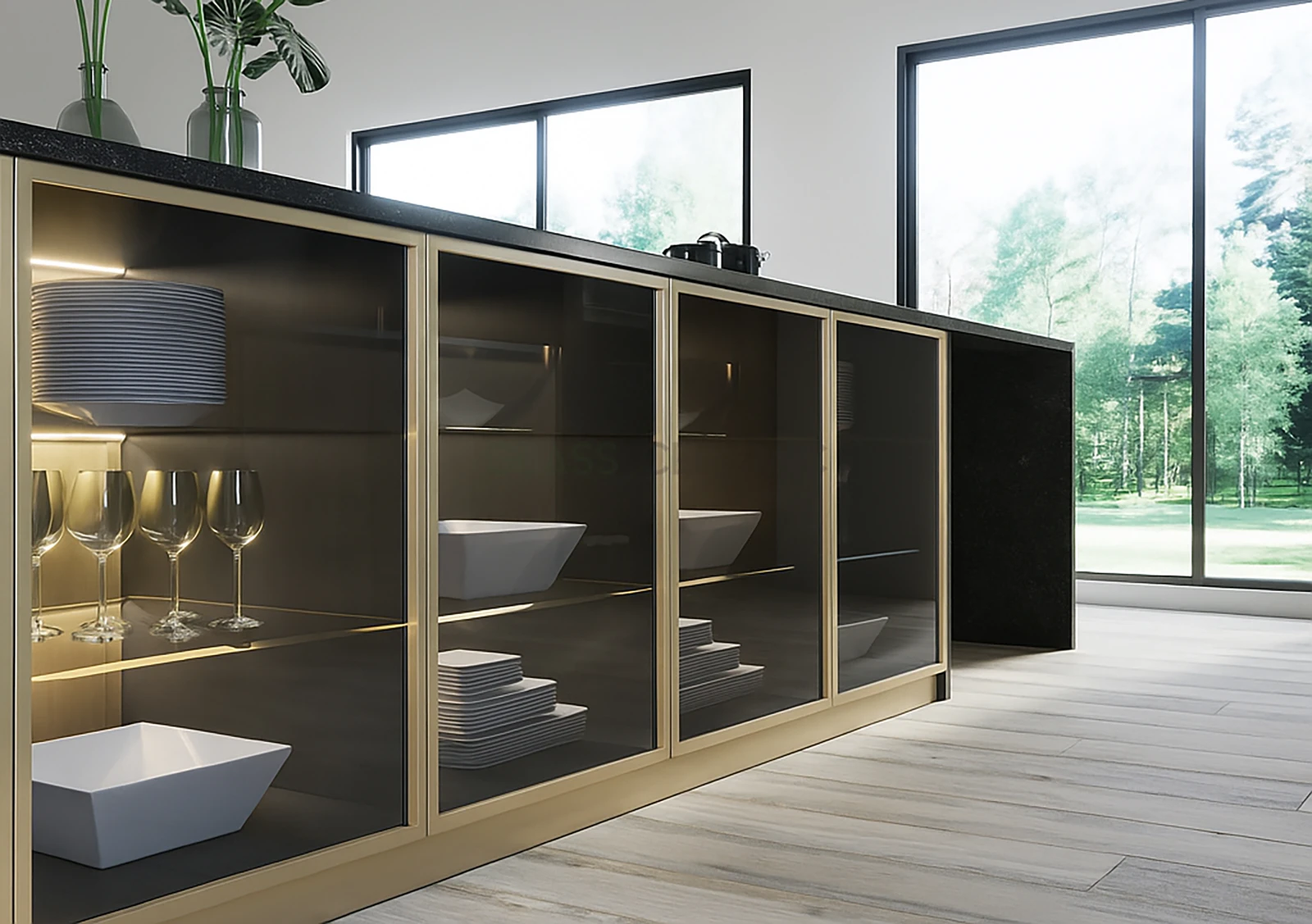 Módulos altos de la cocina en modelo Beta y vidrio Flutes
